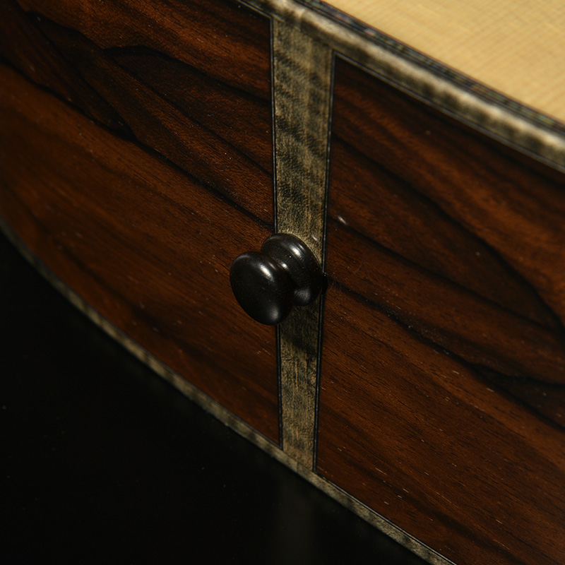現在、Headwayの最高峰ライン”カスタムショップ”を担うのは、故百瀬氏のもと、若いときから直伝で技術と経験を積んだ、現在のHeadway を支える両雄である安井雅人氏と降幡新氏の二人。このギターは、そのうちの安井氏が製作したワンオフのギターです。 一流のギタークラフトマンは加工技術そのものだけでなく、状況を俯瞰する視点、柔軟な発想、その発想を形にする実行力も持ち合わせているものです。2002年から本格的にギター作りの道に入った安井氏は、飛鳥チームビルドシリーズにおけるチームの実質的なリーダーとしてその力を発揮。現在はこのシリーズと平行して、自身のカスタムモデル制作も行います。
