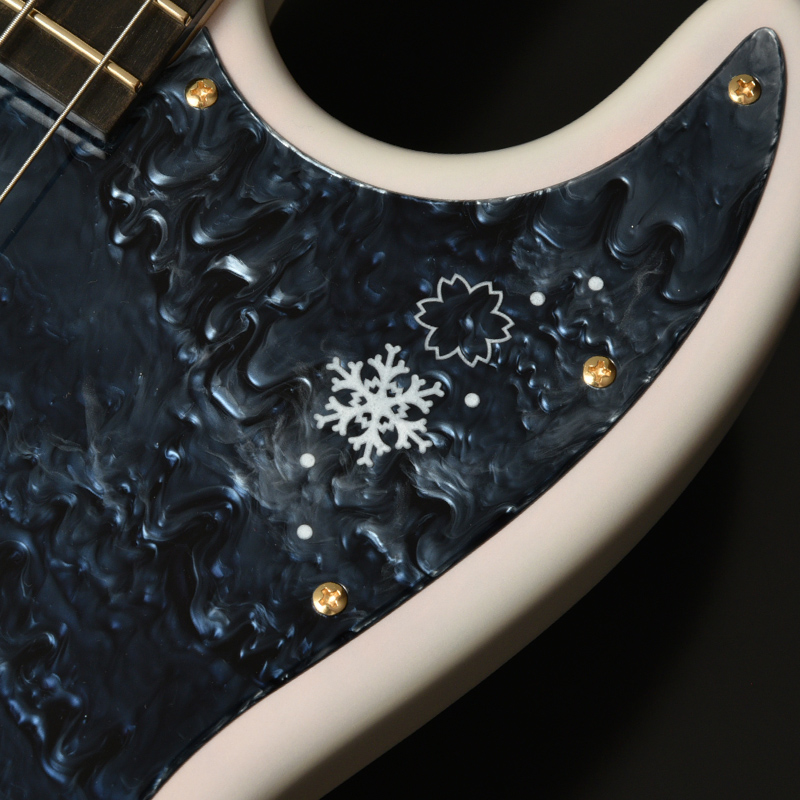 インレイデザインはヘッドトップとピックガードロゴにも及んでおり、共通のデザイン性を持たせることでモデル全体で厳かな冬に咲く桜を表現しております。