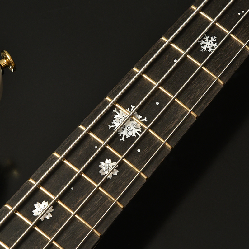 指板インレイでは桜の花が凍ったイメージを取り入れながら、指板全体に及ぶツリーオブライフをモチーフとしたインレイデザインを行っております。桜の花びらも雪の結晶をデザインに取り入れ、冬の寒さも表現しております。指板全体に及ぶインレイデザインはパーツ点数が多く、加工の精度が求められる為少量生産だからこそ出来るインレイデザインになります。