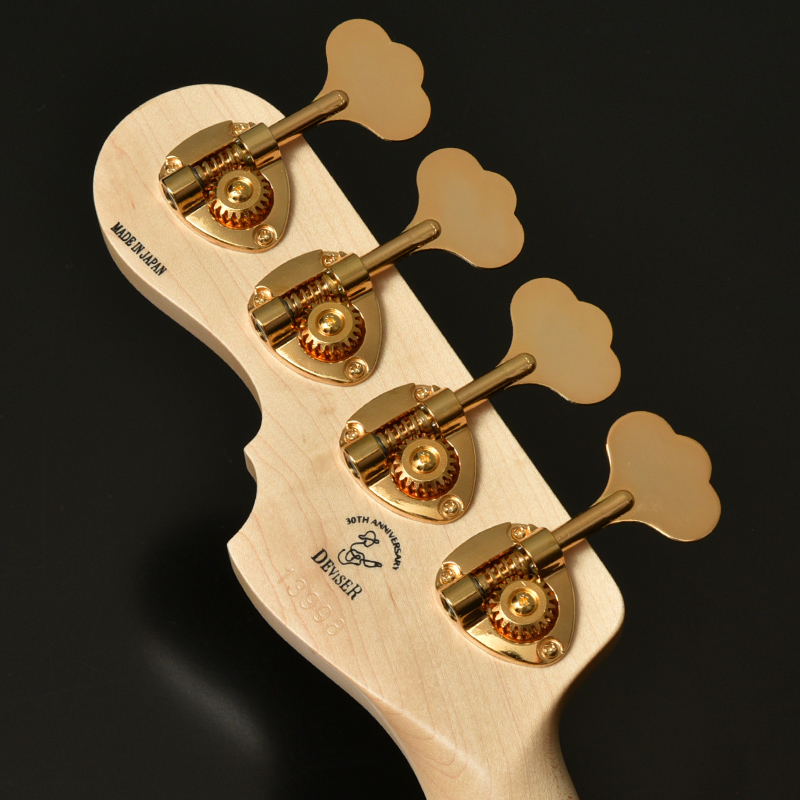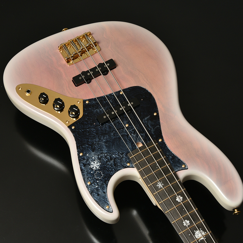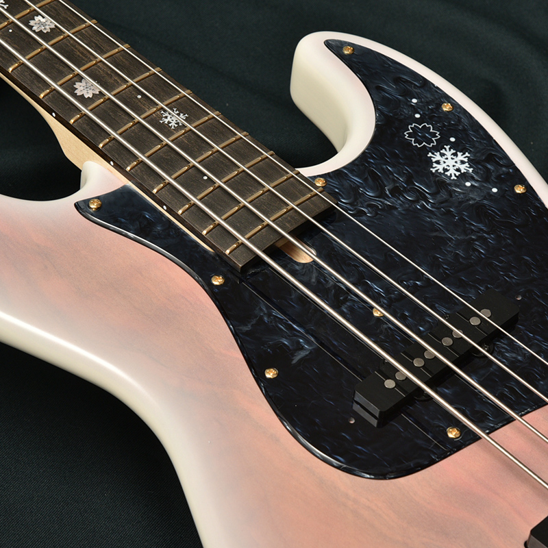 ピックアップ位置はブリッジ位置に若干近づけた70年ライクな配置に設定。サウンドがよりトレブリーになり、ベースラインのみならず、テーマやソロでもよく抜けます。 桜トップ、アッシュボディは高音域と低音域がよく出る材であるため、レンジが広く様々な音楽ジャンルに対応することが出来ます。 音の立ち上がり、そしてキレが良いためスラップなどを多用する演奏スタイルにも向いており、様々な現場で活躍するモデルとなりました。