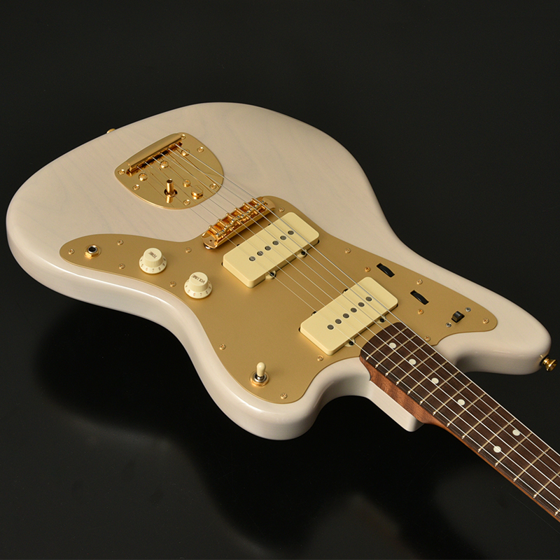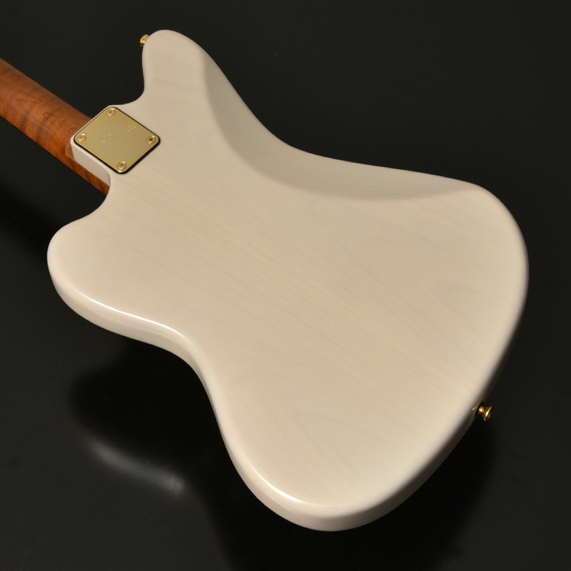 ネックはサーモ加工を施されたフレイムメイプル に Jescar Evolution Gold と外観の美しさと完成度の高さがうかがえます。アノダイズドピックガード、ゴールドハードウエアが高級感を漂わせています。ピックアップはもちろん MOJOTONE を搭載しています。ヴィンテージスタイルながらサーモ加工や、ゴールドフレットなど主張が多い特別仕様です。