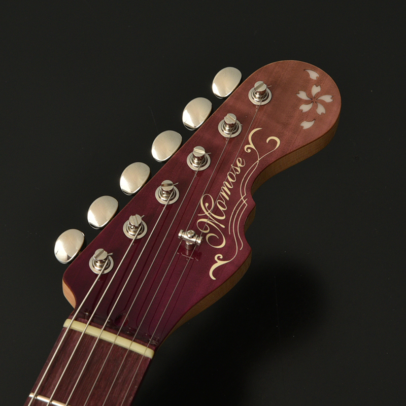 パープルハート材の指板だけでなくヘッドやピックガードにも桜のインレイをあしらった和テイスト溢れるモデルです。
