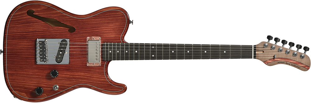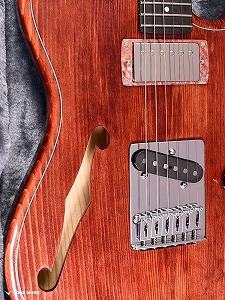ホロウボディの魅力と独特なサウンドを生み出すため、「ロングスケール(25 1/2インチ)」と「ミディアムスケール(24 3/4インチ)」の中間である25インチスケールを採用しております。ボディ形状とボルトオン構造から想像されるよりも若干緩めのテンションが「ルーズ感」を与え、ロングスケールのギターだとテンション感がきつくチョーキングなどもし辛いと感じるプレーヤーにもおすすめです。