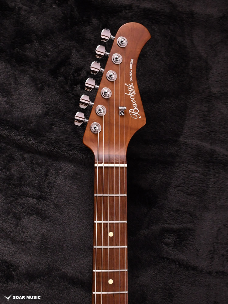ネックにはBacchusの新機軸でもあるローステッドメイプルを採用。 ローストする工程上でゆがみが生じてしまうような木材はその時点で淘汰されるため、ネックとして搭載されている個体は非常にゆがみやねじれに強く、比較的手に取りやすい価格帯ながら長い間ご愛用できる仕様となっております。