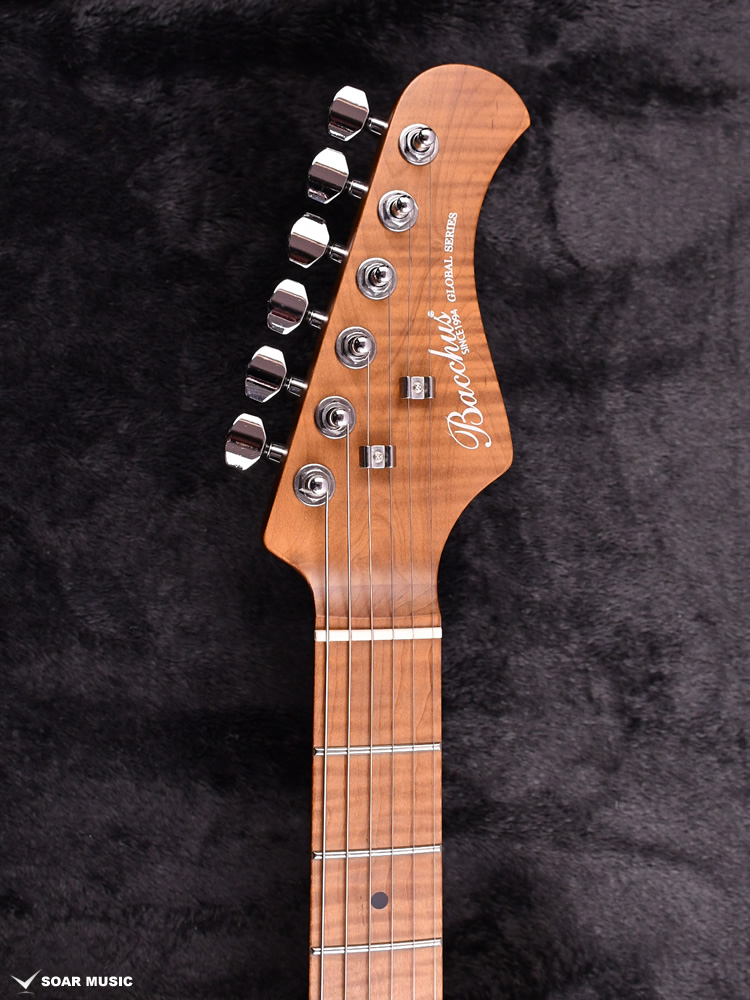 ローステッドメイプルとはメイプルを高温で加熱処理して材の中の水分や油分を揮発させることにより剛性を高めた材。ネックに使用されるとその効果は安定性だけでなくサウンドにも及び、豊かな生鳴りと経年変化したビンテージのようなこなれたトーンを生み出します。高級機種で使われることの多いこの本格派仕様をリーズナブルな価格帯に落とし込んだBacchusの新しい製品ラインナップです。