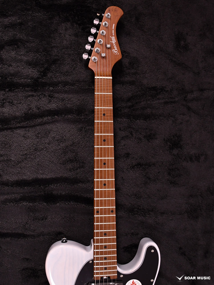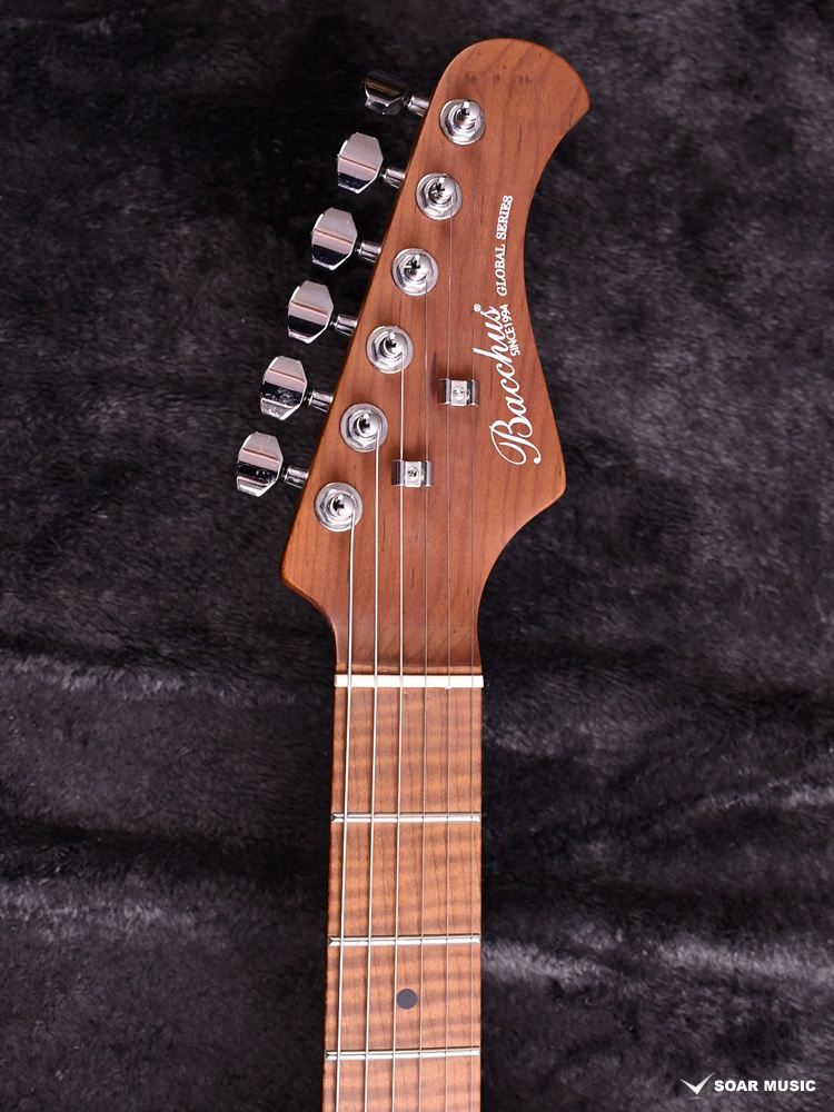 ローステッドメイプルとはメイプルを高温で加熱処理して材の中の水分や油分を揮発させることにより剛性を高めた材。ネックに使用されるとその効果は安定性だけでなくサウンドにも及び、豊かな生鳴りと経年変化したビンテージのようなこなれたトーンを生み出します。高級機種で使われることの多いこの本格派仕様をリーズナブルな価格帯に落とし込んだBacchusの新しい製品ラインナップです。