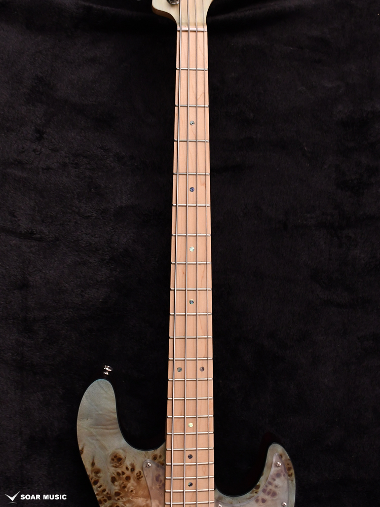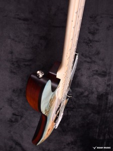 指板はボディトップのカラーリングに合わせてメイプルを採用。ポジションマークに使用している見た目にも美しいアバロン貝は、見る角度によって輝きが変わり、全体の淡い色合いにアクセントを付け加えます。