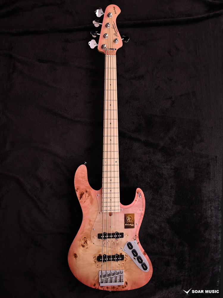 本モデルは過去にBacchus Handmade Seriesから限定モデルで登場した、KRB(渓流ブルー)とSYP(ソメイヨシノピンク)のカラーリングを踏襲した淡い色合いで仕上げています。薄い色のバーストは技術を要しますが、国産モデルを製造している飛鳥工場の職人の熟練した塗装技術を再現。メイプルの指板を含めてベース全体の外観を柔らかな雰囲気でまとめました。