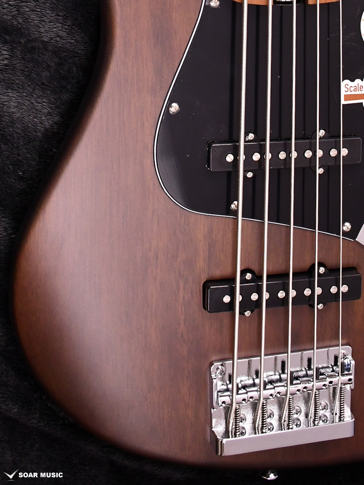 フルサイズのモデルよりもわずかに細身のディンキーシェイプのボディを採用した5弦エレキベースです。ボディ材にはナトーを採用し、楽器としてバランスの取れたサウンドとなっています。