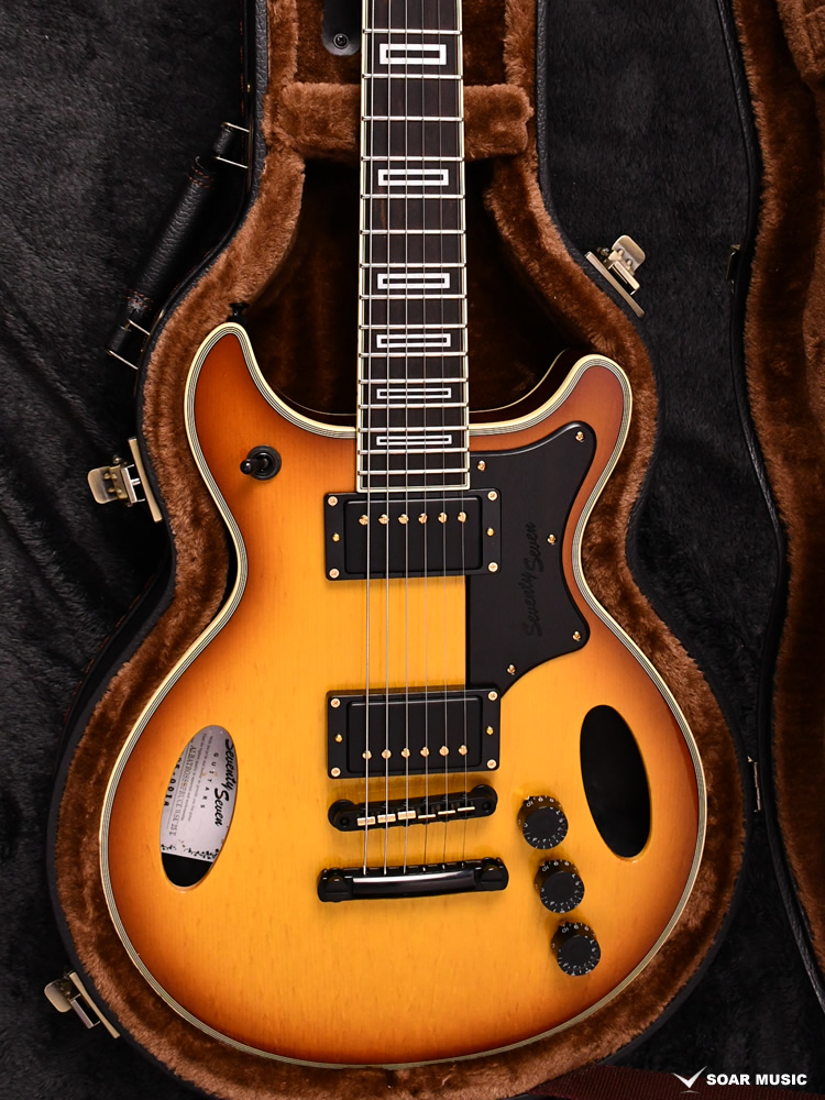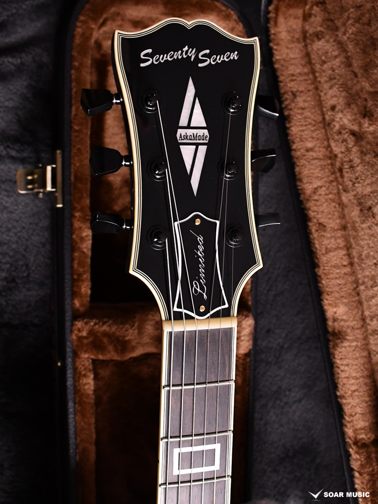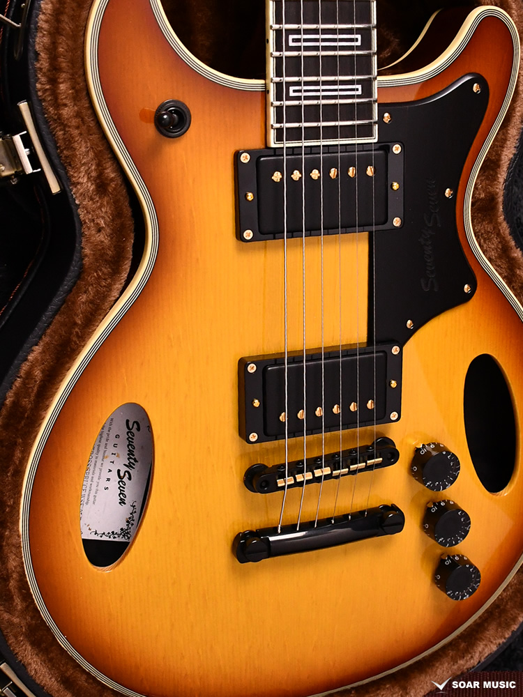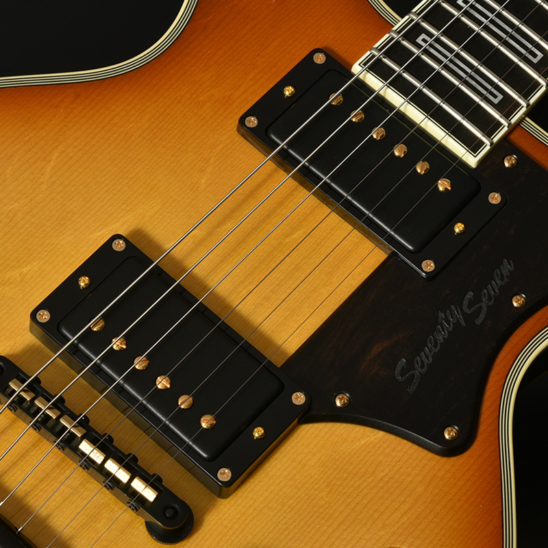 ピックアップにはMojotone×SeventySeven共同開発の “Classic 77Humbuker″ を標準搭載。セミホロウ構造とのマッチングを考え、磁力の弱いアルニコ2マグネットの採用、通常よりコイルのターン数を抑えた仕様となっています。クリーン、ドライブのどちらでもクリアな音が保たれ、引き締まったボトムエンドと豊かなサスティーンが特徴です。