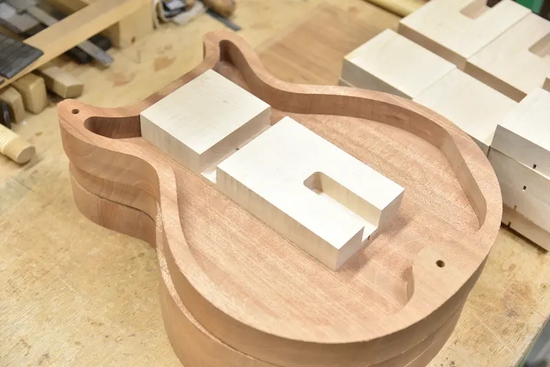 空洞部分をくり抜くチェンバー構造とは異なり、一度ボディ全体をくり抜いてからセンターブロックを配置しています。この構造により、小さいボディながらも豊かな低音とふくよかな生鳴りを実現。耐久性を残しながら程よく面積を削ることにより、ホロウボディらしいエアー感とソリッドなレスポンスを両立させています。