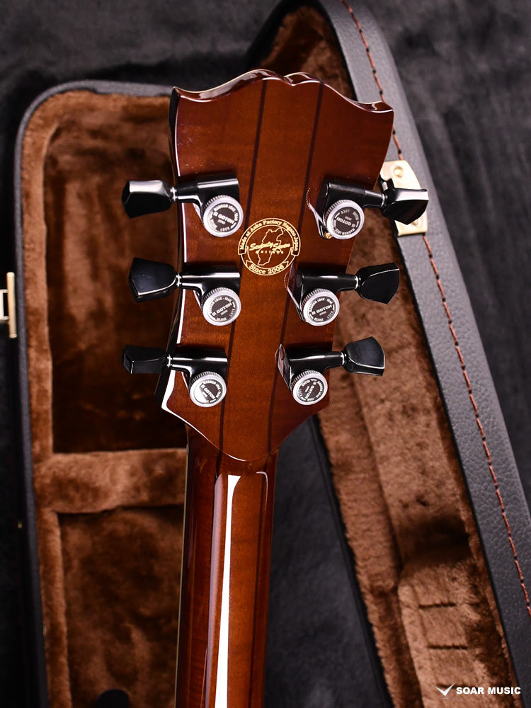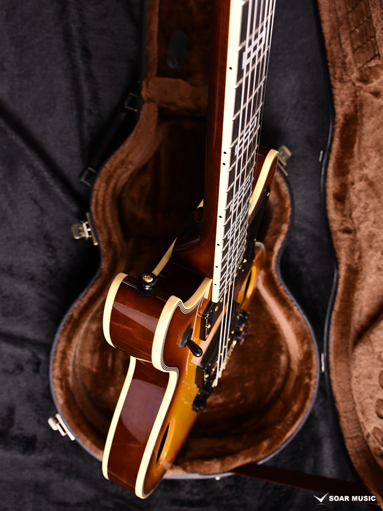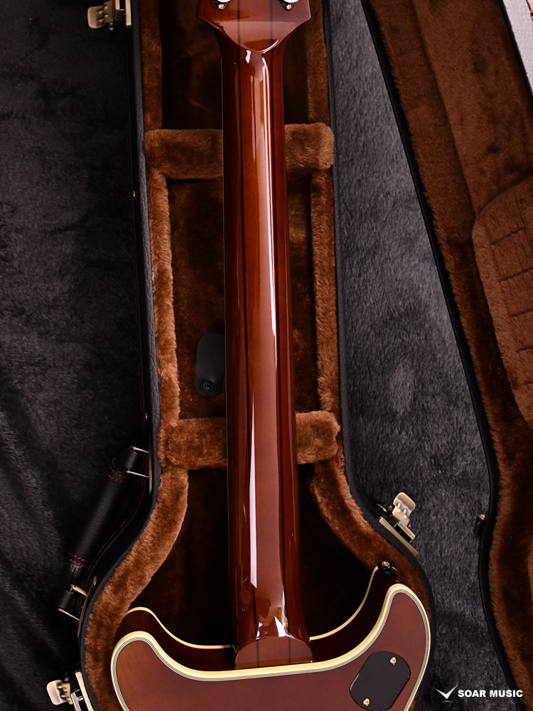 ボディトップにはアコースティックギターの材料として知られるスプルース材を使用。ホロウボディのALBATROSSにとって理想の音響特性を持った木材です。バック材としては、和材の中でも相性の良いトチを採用しています。中〜高音域にかけて抜けの良いサウンドを持つ木材で、アコースティックなトーンの中にもエレキギター然とした芯のあるサウンドを確立しています。 本機のカラーリングには温かみのあるIce Tea Burstを採用しました。より現代的デザインに仕上げるため、熟練の塗装技術による通常よりも細いバーストが用いられています。