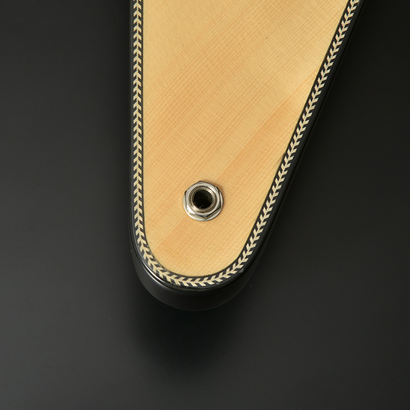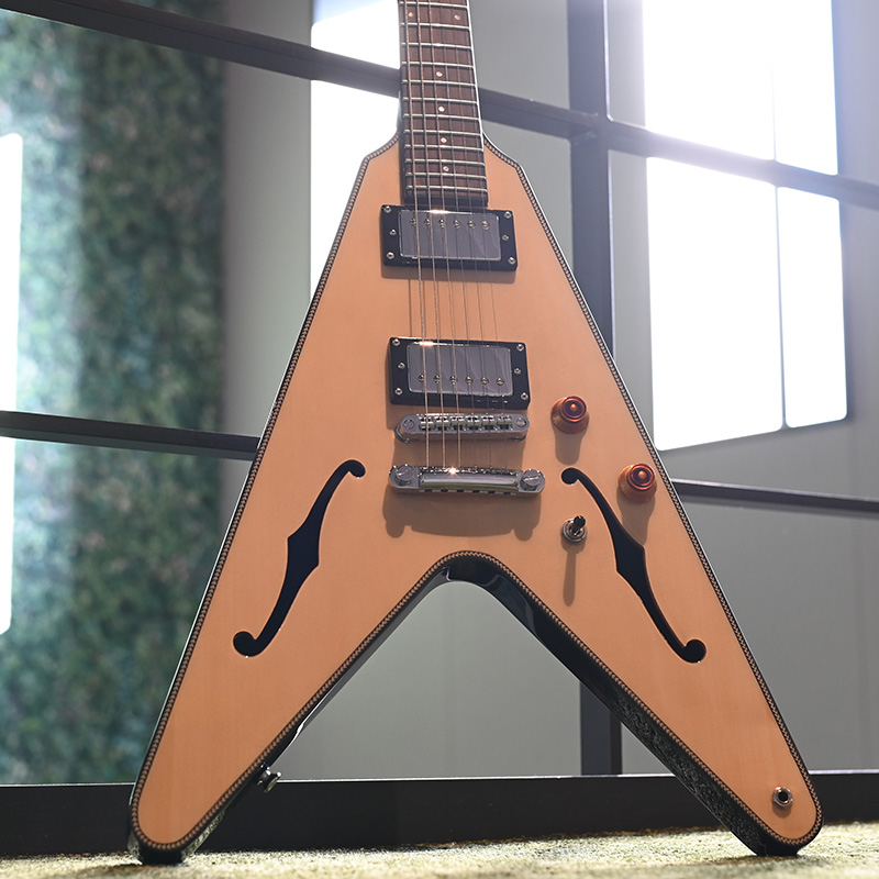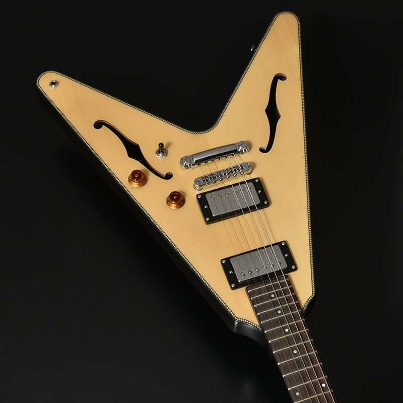 Fホールを有するセミホロウボディを採用した「BFV-JAZZ」。ボディのトップにはアコースティックギターでは定番のトップ材であるスプルースを使用。ナト―材のボディを可能な限り大きく掘り込むことによってボディ内部に広い空間が生まれ、そこから生まれる豊かなアコースティック・トーンが最大の魅力です。