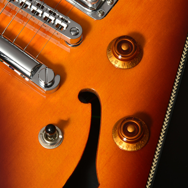 弦振動をよりダイレクトにボディへ伝えることのできるT.O.Mタイプのブリッジを搭載。トレモロユニットがないため弦の張力が安定し、チューニングが狂いにくく、また弦振動がボディにダイレクトに伝わりやすいためサスティーンが得られやすい機構です。ピックアップセレクターには瞬時にポジションの切り替えが可能なトグルスイッチを採用しています。