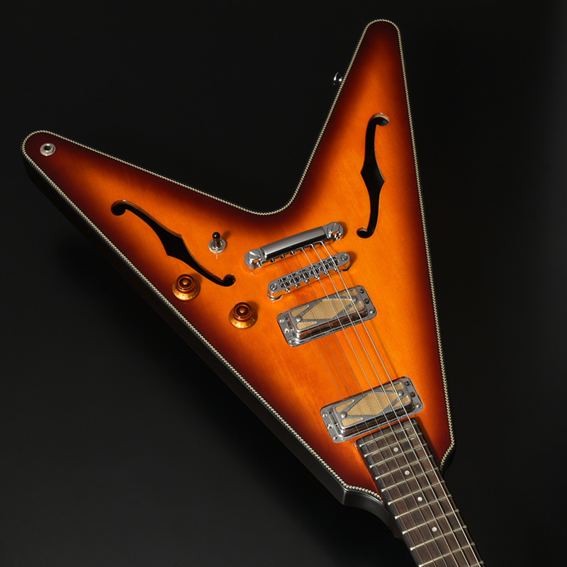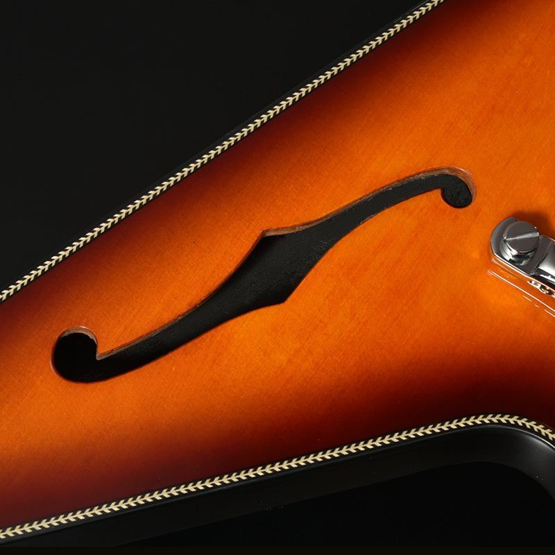 Fホールを有するセミホロウボディを採用した「BFV-JV」。ボディのトップにはアコースティックギターでは定番のトップ材であるスプルースを使用。ナト―材のボディを可能な限り大きく掘り込むことによってボディ内部に広い空間が生まれ、そこから生まれる豊かなアコースティック・トーンが最大の魅力です。