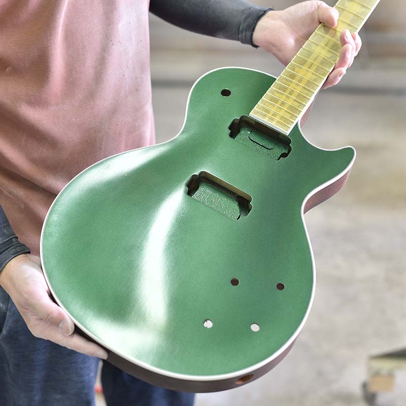 この塗装の技法として、着色層およびトップに使用されたラッカーの塗膜は一般的なグロス仕上げよりも薄く仕上げられており、ボディ材の振動を妨げることなく、木材本来の生鳴りを最大限に引き出します。