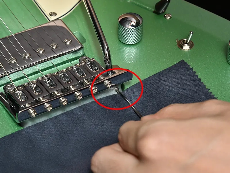 トレモロブロック側面のイモネジを締め込むことで、アームを固定するトルクの調整が可能です。アームダウンを行いイモネジ部分を露出させ、本体付属の1.5mm径のレンチにて調節を行ってください。