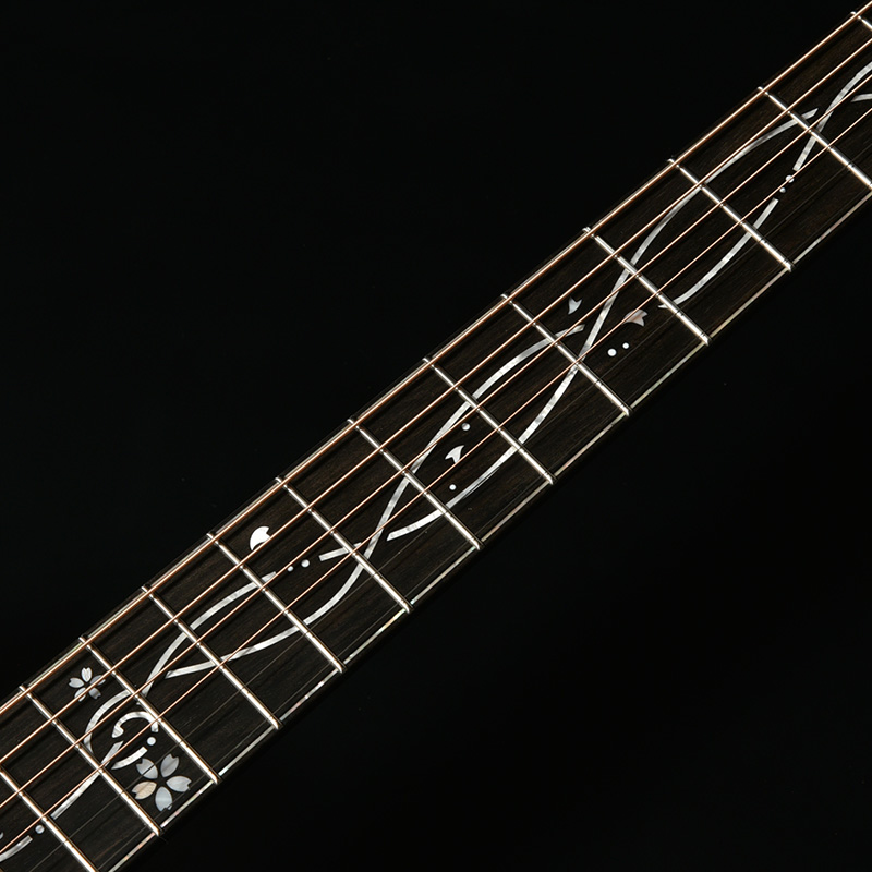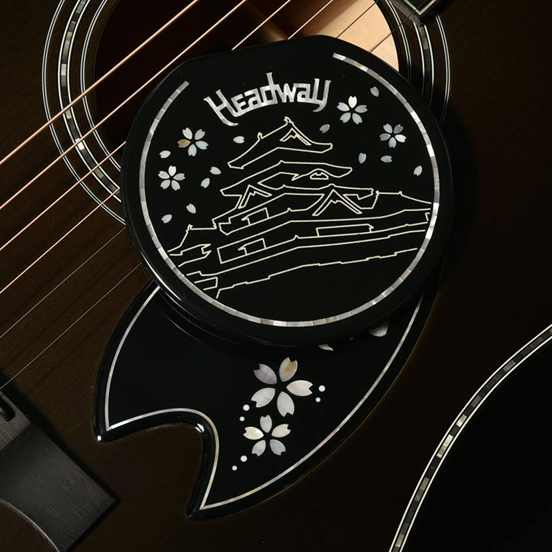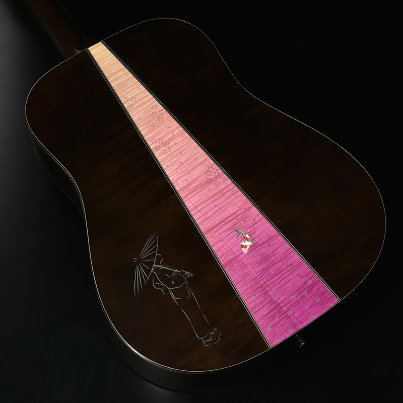 桜ギター一番の特色であるボディサイド・バックの桜材は特有の中音域に特徴のある私達が”桜サウンド”と表現する音色を聞かせます。さらにボディバックセンターに同じく和材のカエデ材を使用し、松本城のお掘をイメージした、四季と優雅に泳ぐ鯉をデザインしています。