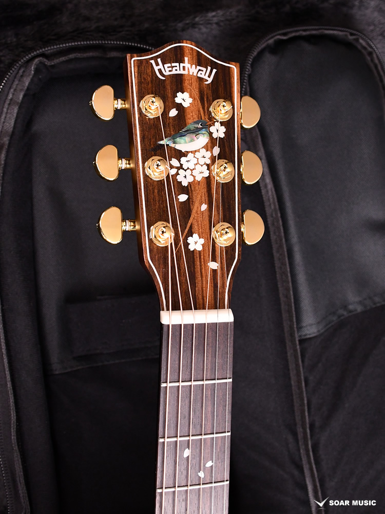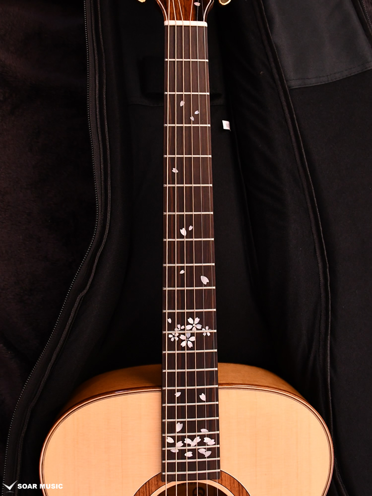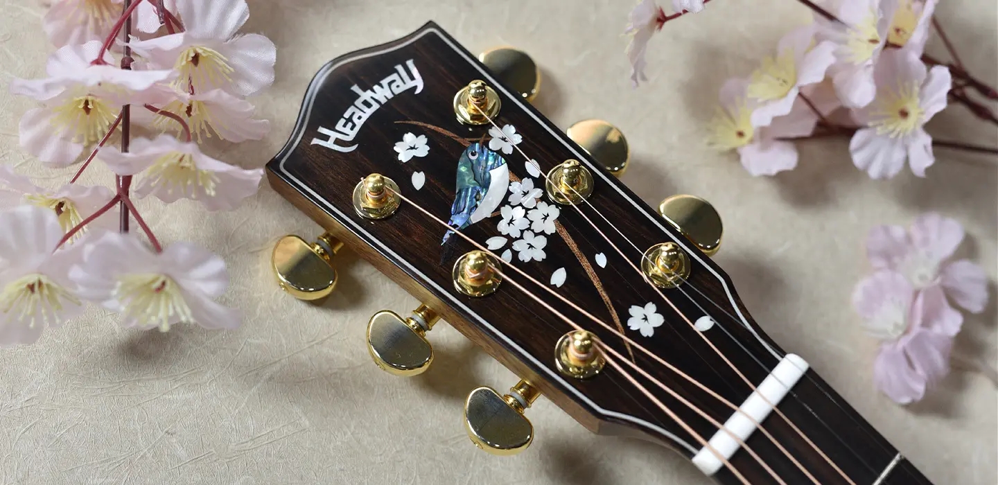 メジロが留まる満開の桜花を描いたヘッドから、花びらが木の幹に見立てた指板上へ「零れ落ちていく」情景を、白蝶貝やアバロン、木材などの素材を惜しみなく用いて表現しました。