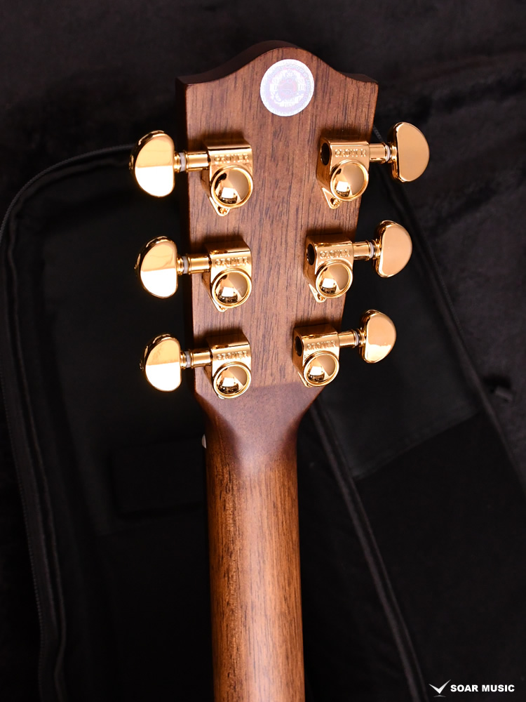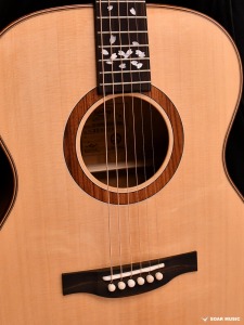 サイドバックと同じく、国産の桜材を用いて作成された本機のみの独自デザインのサウンドホールプレート。