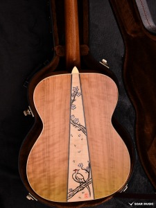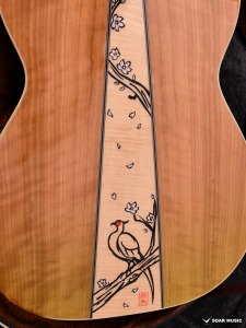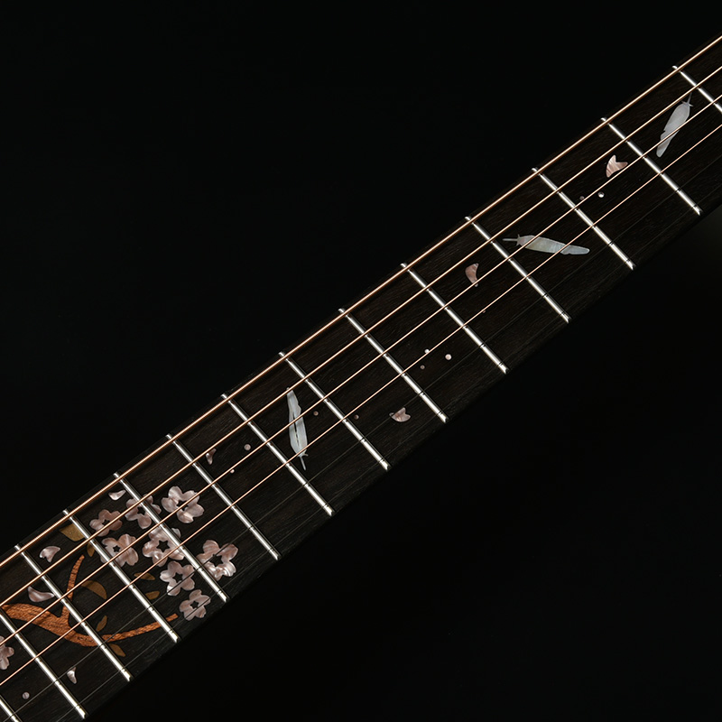 エボニー材の指板にて、インレイワークで桜の花とキジの羽がデザインされています。キジのテーマに合わせた和のテイストを目指し、天然貝や木材など複数の素材を使い分け製作しました。美しい桜の幹と花びら、そして舞い落ちるキジの羽を表現しています。