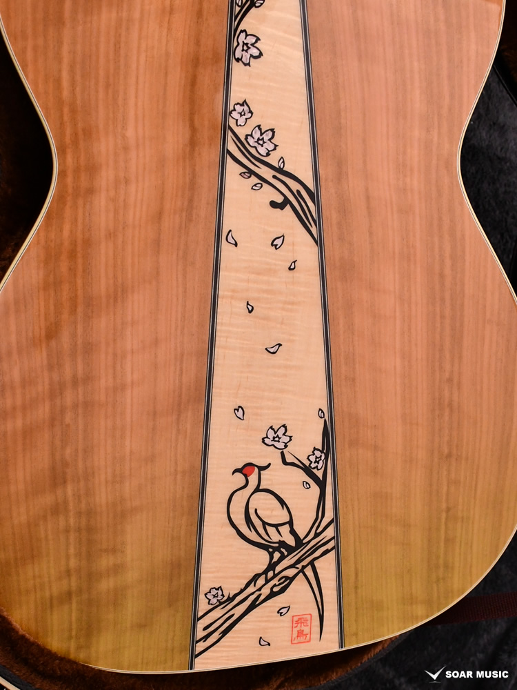 ボディバックのセンターは墨で描かれた掛け軸をイメージしております。単に塗装で墨絵風に表現するだけに留まらず、桜の花にはインレイを埋め込むなど複数の技法を組み合わせることで生まれた奥深さがあります。ファクトリーの「飛鳥」も押印されており、これは職人が1本1本手作業で押印している為、僅かな個体差が手に取った1本だけの特別感を演出します。