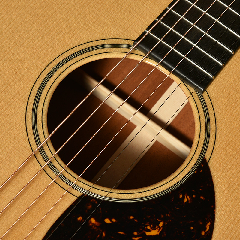 ブレイシングは、1934年頃のスタイルをインスパイアしており綺麗で澄んだ音色でありながらも甘さとまろやかさも感じることができ、フィンガー・コードプレイを問わずに気持ちよく弾けるギターになっています。