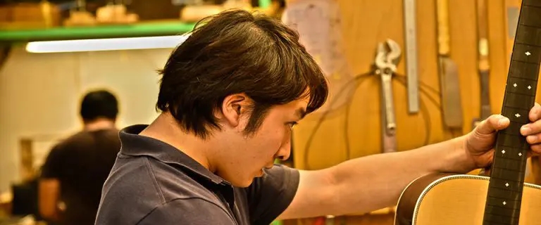2009年の入社後からHeadway Standard seriesの生産に携わり、材料準備から加工など担当した後エレキギターの加工工程を経て再びアコースティックギター制作に携わります。百瀬恭夫、安井雅人はじめ先輩職人から直接の指導を受けつつ、甲貼りや木材準備、ネックの仕込みなど各作業を担当。Aska Team Buildシリーズでは甲貼り、ネック仕込みなどサウンド面の要を担う作業を主に担当し、実質的なシリーズの音作り、仕上げ全般に責任を持つ職人です。 2018年5月から、Aska Team Buildシリーズの製作と並行してCustomshopモデルを製作しています。安井雅人がこれまでに無かった新しいHeadwayを模索する一方、降旗は百瀬のギター作りを忠実に継承しながらさりげなく独自色を織り交ぜていくといった作り方を得意としています。