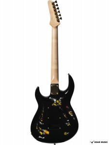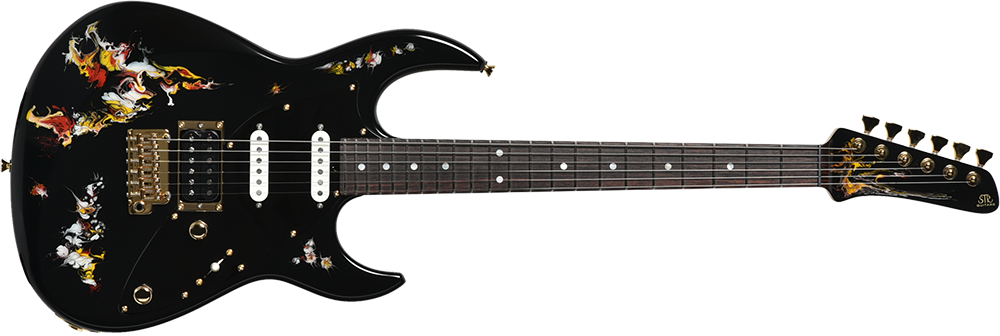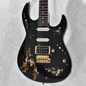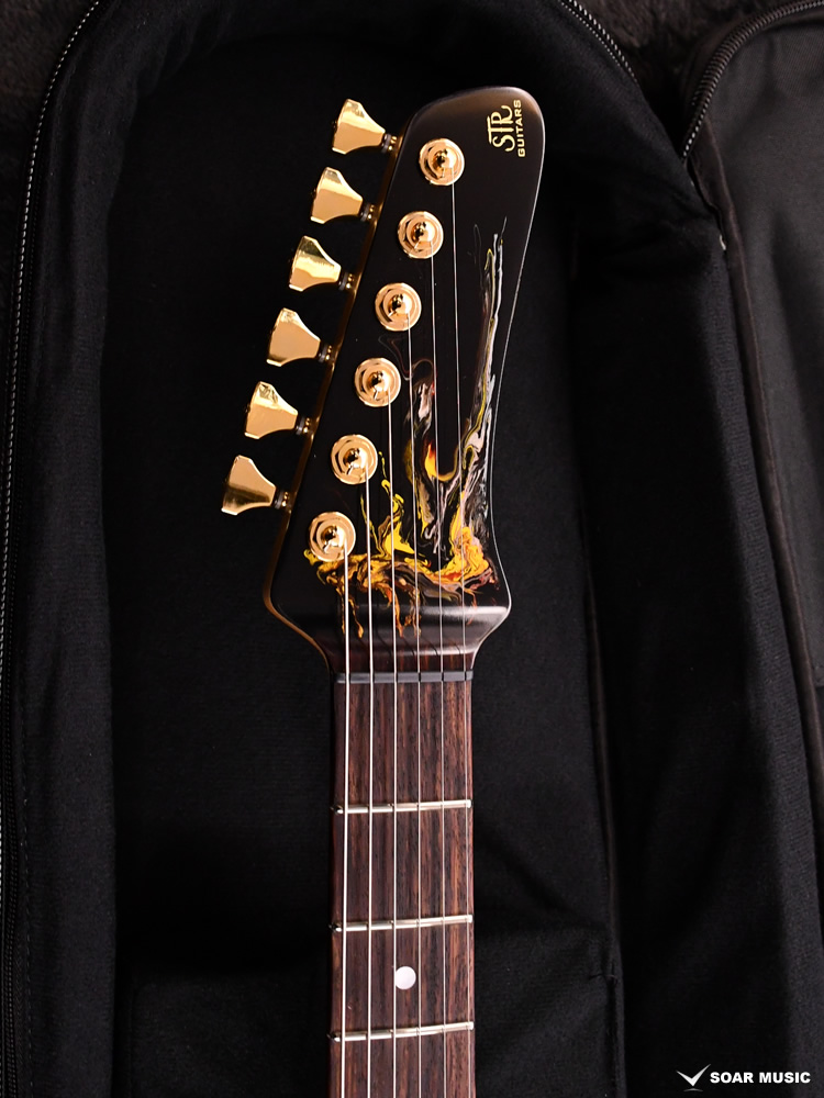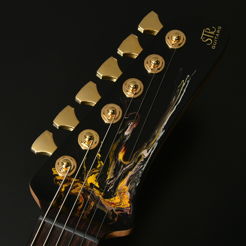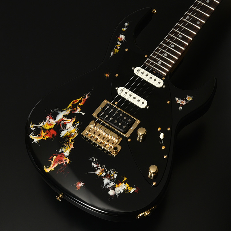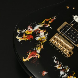 水中に絵の具を垂らした瞬間に広がる流線模様で描く「フルイドアート」と呼ばれる技法に着想を得て、飛鳥の塗装職人が独自の手法で仕上げた一本。フルイドアートの技法を応用し、日本画を想起させるような繊細な線や筆の運びをイメージ。ボディトップのコンター部分には暗闇の中で燃えさかる炎にも似た印象のデザインとなり、唯一無二の1本として完成しました。ボディバックとヘッドトップにも同様の塗装が施され、実機全体にこの流線による繊細な意匠が広がります。