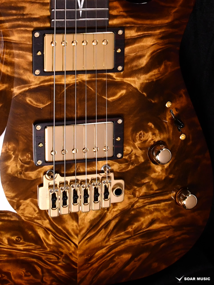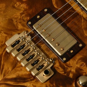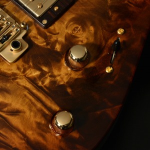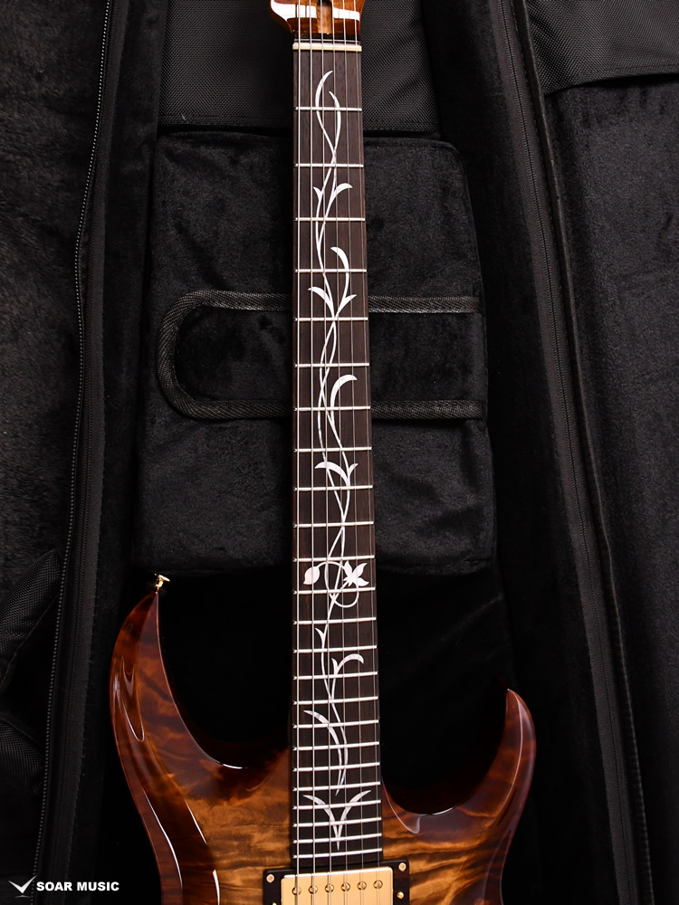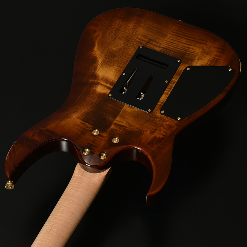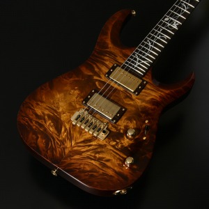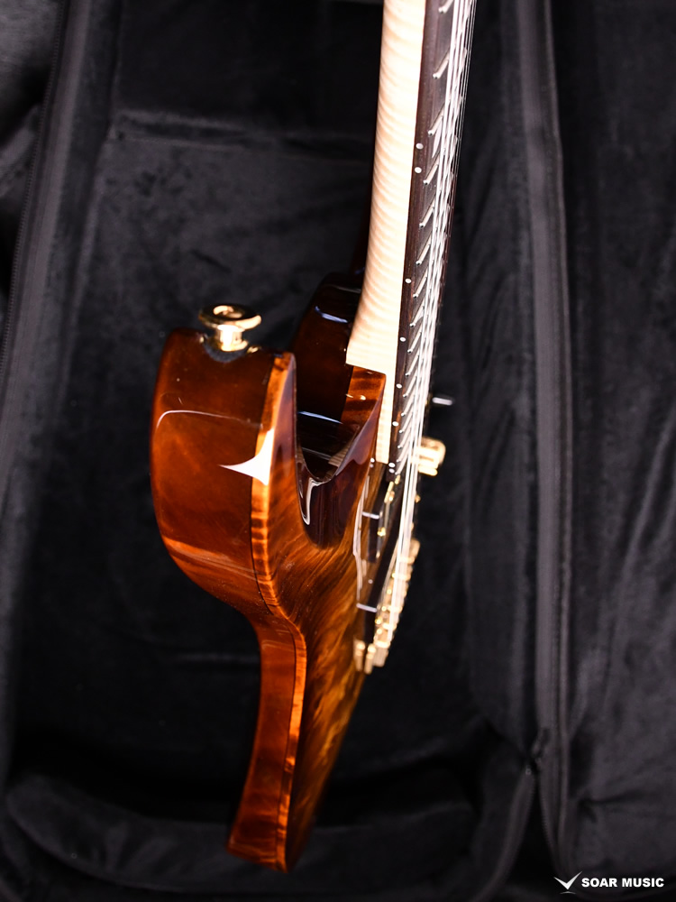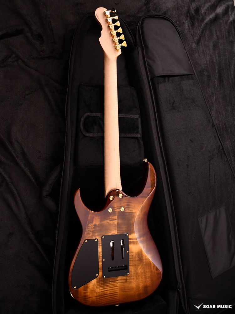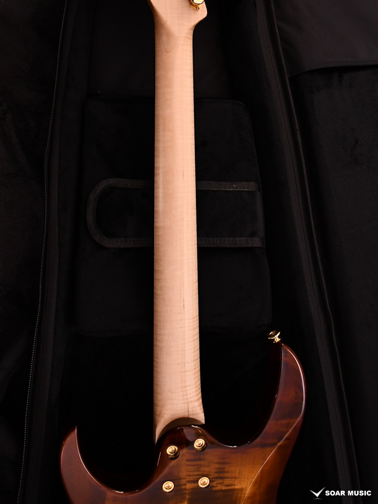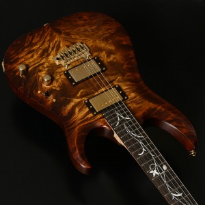 ボディトップ、バックそれぞれに最高グレードのフレイムトチを使用し、その杢目を最大限に生かした美しいバーストカラーが施されています。バック材にもトチが用いられていることにより、サウンド面でもその持ち味が発揮され、特徴的な中〜高音域にかけて広がる抜けの良いトーンを存分に感じることができます。