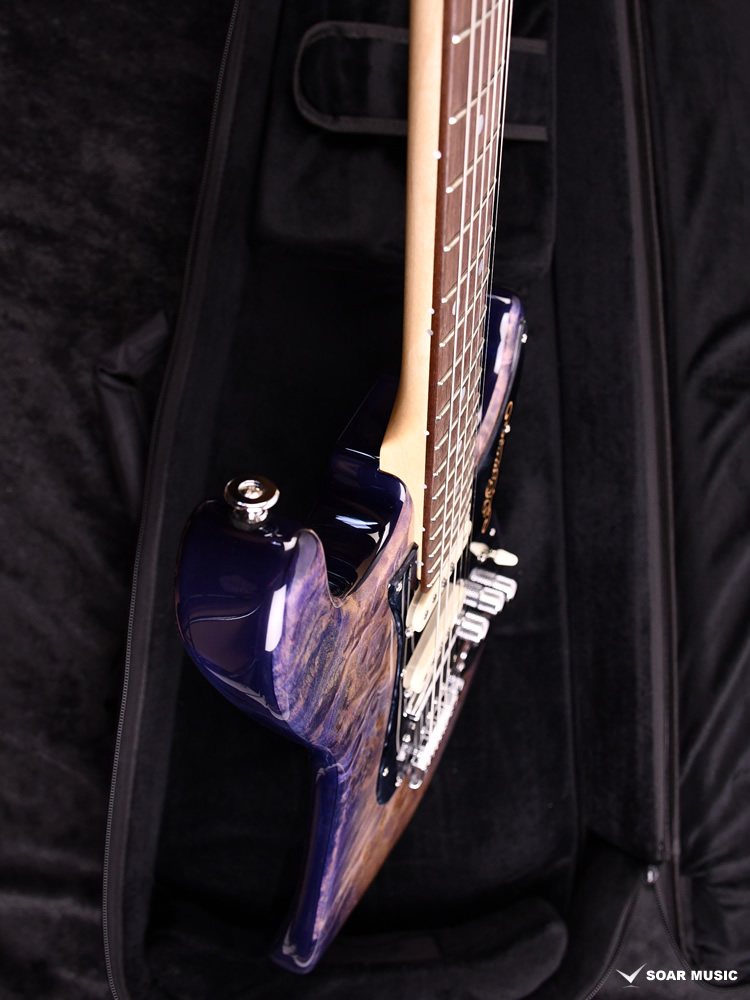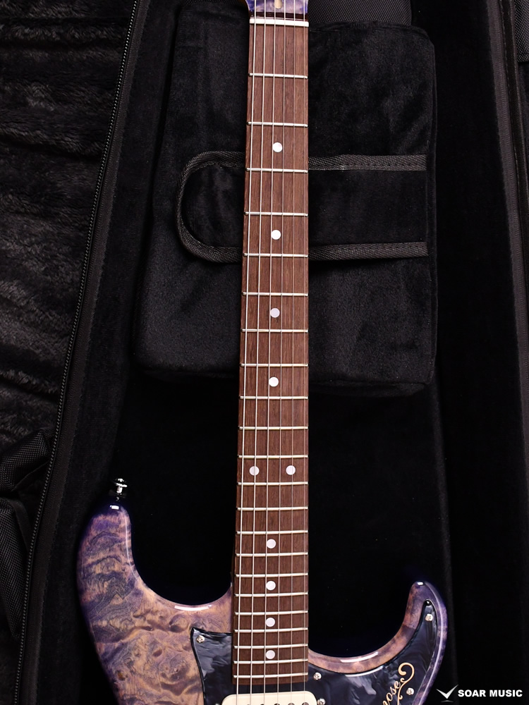 ピックガードには特注で製作しているダークブルーパールのアクリル素材をセレクトしており、ボディカラーとのマッチングで洗練された印象を与えます。
