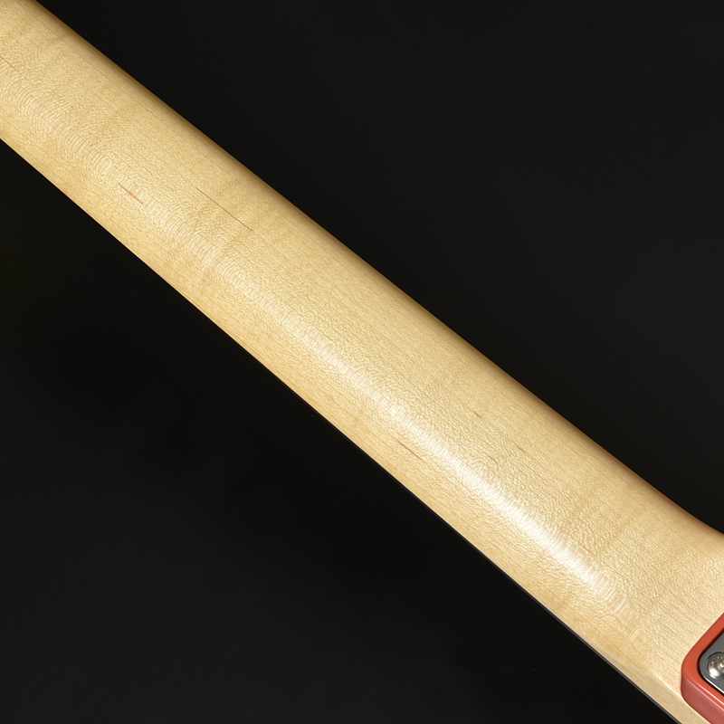 一般的なエレキギターのネックよりも反りに強い「柾目」で木取りました。丸太から木材を切り出す際に、歩留まりが悪く多くはとれない木目ですが、ネックに使用した場合、弦の張力に対して木目の向きが強くなり、結果として順反り、逆反りといったエレキギターにありがちなネックの動きが少ない、強いネックに仕上がります。