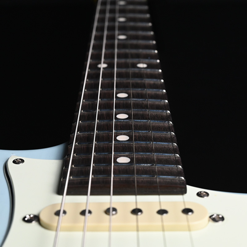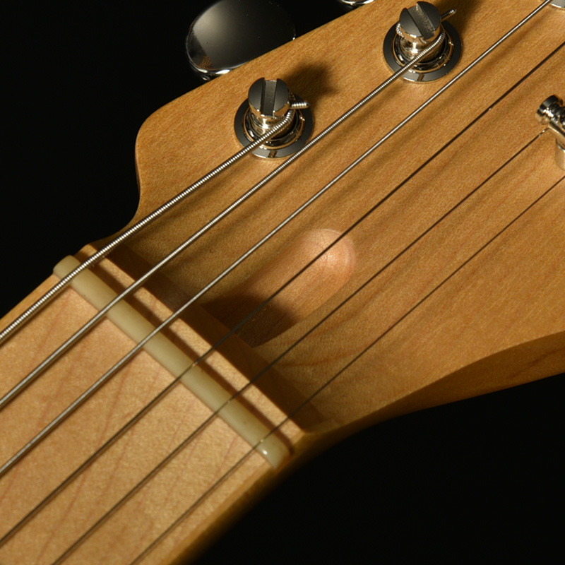 指板サイドには指板と同材を使用したウッドバインディングが施されています。これにより指板サイドが非常に滑らかになるほか、フレットのバリが飛び出してしまうようなトラブルも防止します。