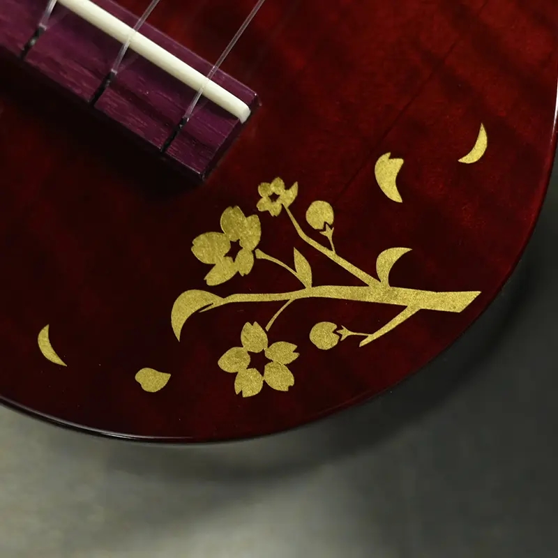 ボディにあしらわれた金箔の桜が映えるよう、濃いグラデーションカラーで仕上げました。 ヘッドトップにも桜材を用いており、ボディ同色のマッチングヘッド仕様に仕立てることで上品な高級感を纏った1本です。