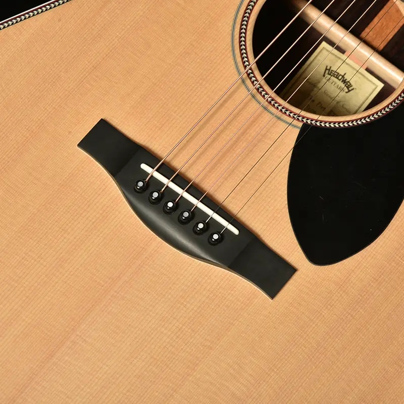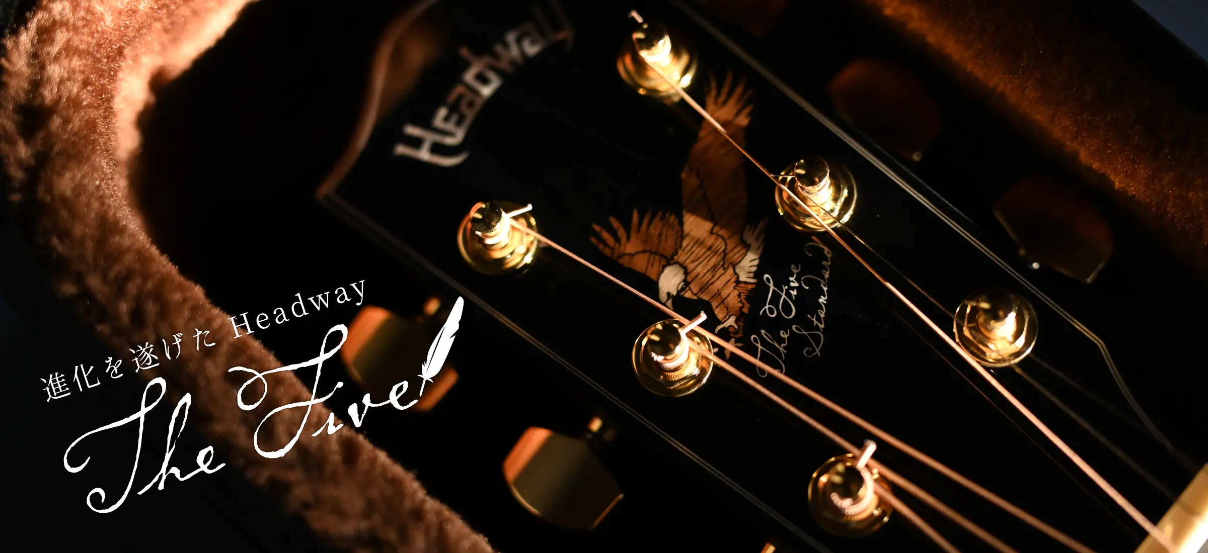 531、523などの品番に代表されるロングセラーモデルを生み出し、Headwayの定番として長年親しまれてきた500シリーズ。そのサウンドの要となるブレーシングパターンなど基本的な構造はそのままに、現代のプレイヤーにとっての弾きやすさを追求したリニューアルモデルが誕生しました。 最大の変更点はそのナット幅。従来の43mmから43.5mmに変更することで、握り込んだ時のグリップはもちろん、フィンガースタイルのプレイヤーにも最適な演奏性を確保しました。 デザイン面でも500シリーズの持つ特徴をより現代的に発展させ、新しくデザインされたピックガードとヘッドのイーグルインレイを採用。指板のポジションマークには、マスタービルダーの百瀬恭夫が愛用していた特徴的な形状を取り入れています。